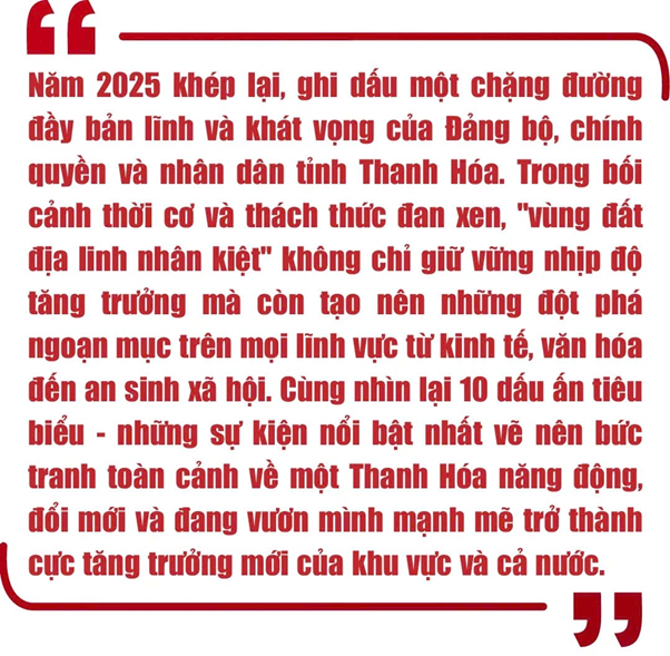 (Baothanhhoa.vn) Năm 2025 khép lại, ghi dấu một chặng đường đầy bản lĩnh và khát vọng của Đảng bộ, chính quyền và nhân dân tỉnh Thanh Hóa. Trong bối cảnh thời cơ và thách thức đan xen, "vùng đất địa linh nhân kiệt" không chì giữ vững nhịp độ tăng trưởng mà còn tạo nên những đột phá ngoạn mục trên mọi lĩnh vực từ kinh tế, văn hóa đến an sinh xã hội. Cùng nhìn lại 10 dấu ấn tiêu biểu - những sự kiện nổi bật nhất vẽ nên bức tranh toàn cảnh về một Thanh Hóa năng động, đổi mới và đang vươn mình mạnh mẽ trở thành cực tăng trưởng mới của khu vực và cả nước.