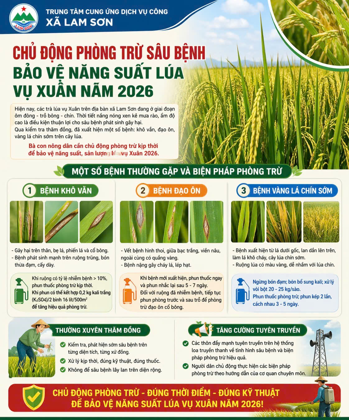 Hiện nay, các trà lúa vụ Xuân trên địa bàn xã Lam Sơn đang bước vào giai đoạn ôm đòng - trỗ bông - chín, đây là thời kỳ quyết định đến năng suất và sản lượng của cả vụ. Trong điều kiện thời tiết diễn biến phức tạp, nắng nóng xen kẽ mưa rào, độ ẩm cao là môi trường thuận lợi cho nhiều đối tượng sâu bệnh phát sinh và gây hại trên diện rộng. Qua kiểm tra thăm đồng, trên địa bàn xã đã xuất hiện một số bệnh phổ biến như bệnh khô vằn, bệnh đạo ôn và bệnh vàng lá chín sớm trên cây lúa.