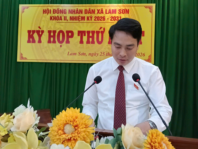 Phát biểu nhận nhiệm vụ, đồng chí Lê Văn Niệm, Phó Bí thư Đảng ủy, Chủ tịch UBND xã Lam Sơn bày tỏ sự trân trọng và cảm ơn sâu sắc tới cấp ủy Đảng, chính quyền, Ủy ban MTTQ, các đoàn thể và cử tri trong toàn xã đã tin tưởng bầu làm đại biểu HĐND xã; đồng thời cảm ơn các vị đại biểu HĐND xã đã tín nhiệm bầu giữ chức vụ Chủ tịch UBND xã nhiệm kỳ 2026-2031, cũng như tín nhiệm bầu các chức danh Phó Chủ tịch UBND xã và Ủy viên UBND xã tại kỳ họp. Đồng chí nhấn mạnh, đây là niềm vinh dự to lớn, đồng thời cũng là trọng trách nặng nề trước Đảng bộ, chính quyền và Nhân dân địa phương.